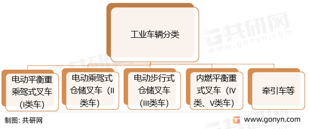 工业车辆指用来搬运、推顶、牵引、起升、堆垛或码放各种货物的动力驱动的机动车辆。国际标准化组织工业车辆技术委员会(ISO/TC110)将叉车称为工业车辆。根据中国工程机械工业协会定义,工业车辆可分为电动平衡重乘驾式叉车(I类车)、电动乘驾式仓储叉车(II类车)、电动步行式仓储叉车(III类车)、内燃平衡重式叉车(IV类、V类车)、牵引车等。